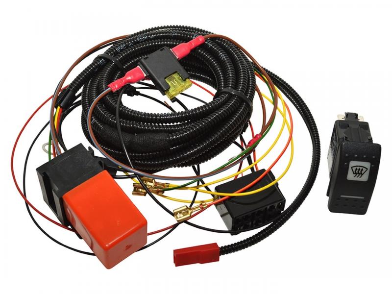 Heated front screen wiring kit complete with Carling Contura switch to suit Defenders fitted with the OEM style heated screens with two tabs or wires – one in each corner. Carling switch will require mounting.