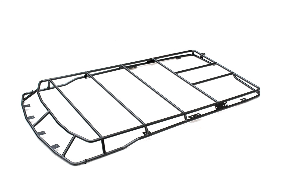Terrafirma roof rack for Discovery 3 and 4 made from CNC bent and laser notched lightweight but super strong steel tube. Designed to fit vehicles with or without the factory alloy roof tracks. The rack as 4 front spot light mounting tabs, 2 side mounting ‘scene’ light mounting points and a rear work light/antenna mounting bracket. The rack is finished in a high quality satin black powder coat.