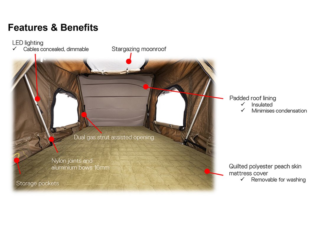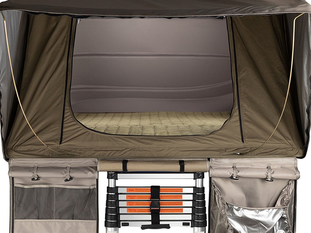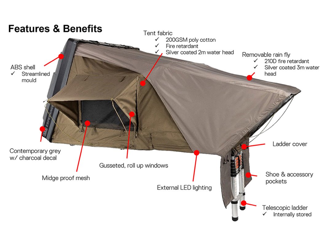 With the brief focused on quick and effortless setup/pack up times, features like an internal telescopic ladder, gas strut assisted opening and only 3 push lock ratchet straps keep travelling a breeze. Not only does Esperance look great at camp but the unique shell design and colour tone also compliments vehicles while packed up.